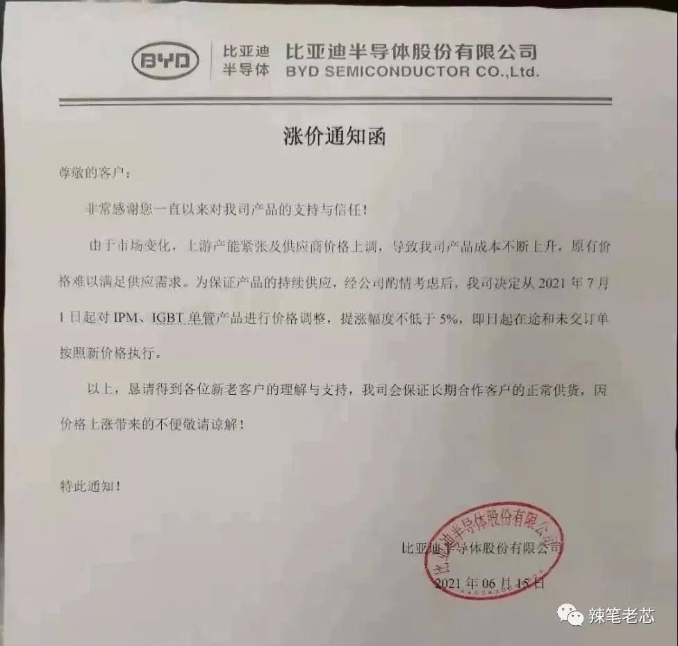 比亚迪半导体6月15日发布通知函表示,因产能紧张及供应商价格上涨,导致原油价格难以满足供应需求,自7月1日期对部分产品进行价格调整,幅度不低于5%。