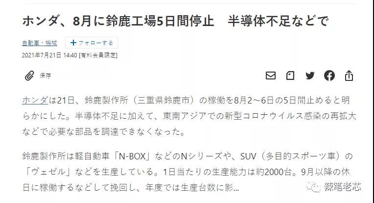 本田:受芯片供应短缺影响,本田汽车在继3月之后,再次宣布位于三重县铃鹿的工厂,下月2日至6日停产,这家工厂日产量约2000辆汽车,包括微型车N-Box以及小型车飞度。