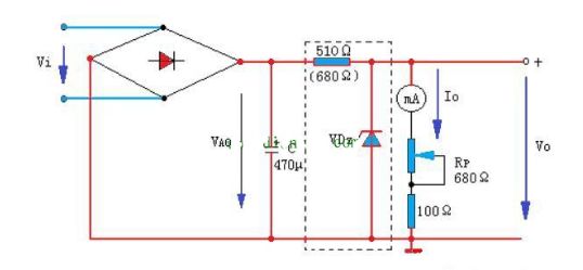 确定了稳压二极管的稳压值之后,需要确定分压电阻的阻值。在这里的电阻主要起到两个作用:一个是提供稳压二极管的工作电流,另一个是限制稳压二极管的最大电流。稳压二极管的电流低时,无法起到正常的稳压作用,过高会出现永久击穿。计算电阻的阻值,需要首先确定两个值,一个是输入的电压范围,另一个是负载电流的变化范围,还有另外的两个参数最小电流以及最大电流,这个可以在稳压二极管的技术手册中查到。