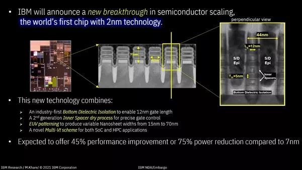 IBM 3层GAA奈米片,每片奈米片宽40奈米,高5奈米,间距44奈米,栅极长度12 奈米。IBM表示,晶片首次使用底部电介质隔离,达成12奈米栅极长度,可以减少电流泄漏,有助于减少晶片功耗。