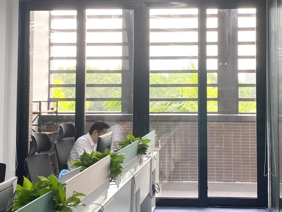 办公区的边上有一排落地窗,窗外还带有一个阳台。偶尔阳台远眺,也让人心旷神怡。新办公室还有一点特别“小气”——所有的管理层办公区都能省则省、能小就小;而所有员工的办公区域则能好就好,无论从灯具到办公家具,都是选用品质高的、有利健康的。