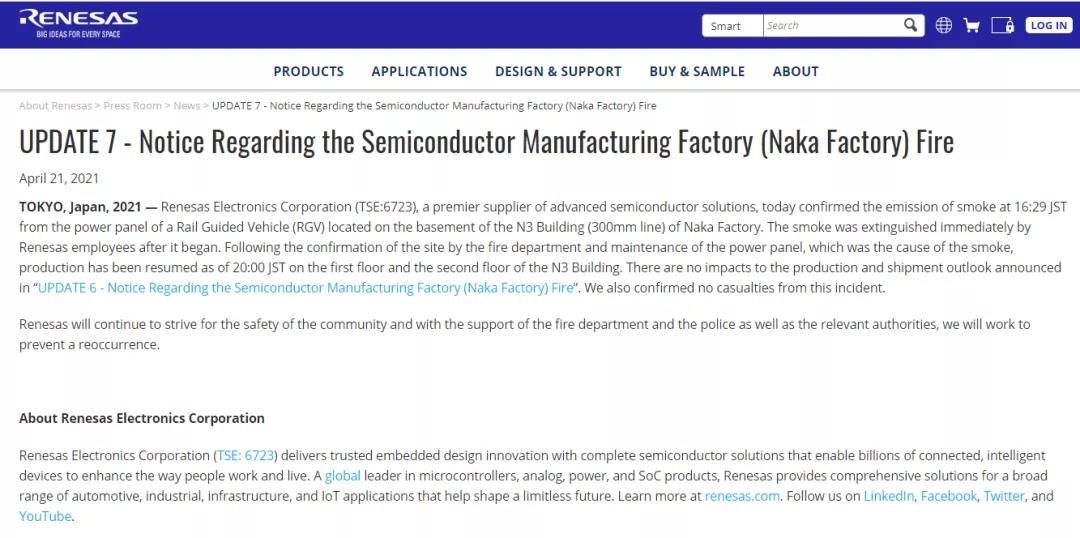 瑞萨21日发布新闻稿,那珂工厂N3栋厂房(两层楼建筑)1楼于21日16点30分左右发生冒烟,不过随即被员工扑灭,而在经过消防署现场确认后,N3栋1楼及2楼已于21日20点左右进行复工。此次只停工约3个半小时,瑞萨表示,此次冒烟停工事件不会对之后的生产、出货预估造成影响。