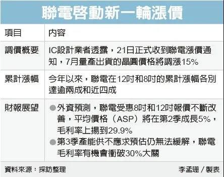 昨日刚传出联电明年将调涨代工价40%,今日便有多家IC设计业者透露,收到联电启动新一波涨价通知,7月产出的晶圆价格将调涨15%,联电并预告「第4季价格还会再涨」。