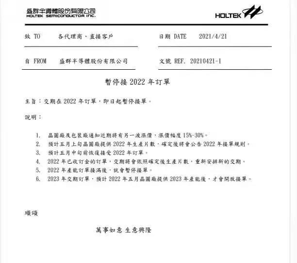 4月21日,盛群半导体发布通知,即日起暂停接单。
