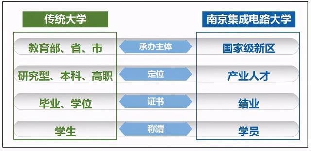 与其他大学相比,南京集成电路大学构建主体、定位、生源、师资、课程和毕业证书都与普通大学不同。南京集成电路大学不是教育部或省、市教育主管部门举办,而是由南京市江北新区管委会根据当地产业发展需要而建。同时,与其他大学以学术为本,以理论知识传授为主的原则不同,这所大学是一个人才培养组织,以技能为本,以实训带教为主,培养的是具备实践能力和专业技能的产业人才。