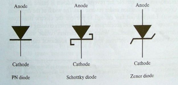 图1.16 PN结,肖特基,和齐纳二极管的电路图符号。有些电路图符号中箭头是空心的或半个箭头。