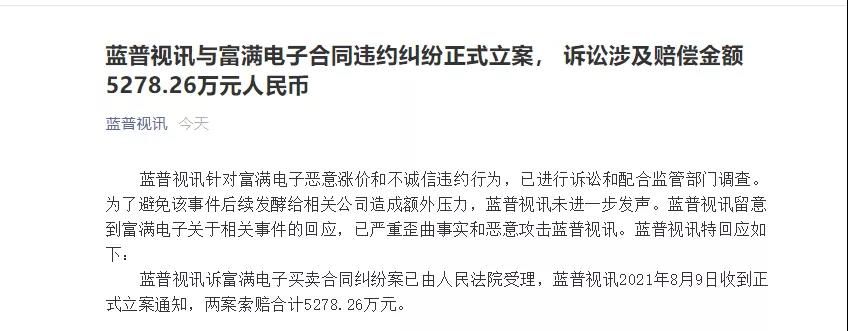 今日,LED显示屏厂商蓝普视讯在其公众号发布了一则公告,公告显示,蓝普视讯与富满电子合同违约纠纷正式立案,诉讼涉及赔偿金额5278.26万元人民币。