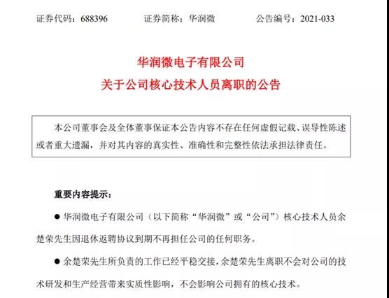 7月22日,华润微发表公告,称公司核心技术人员余楚荣因退休返聘协议到期不再担任公司的任何职务。