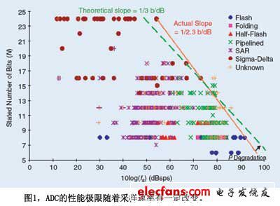 ADC芯片朝着减小功耗的方向前进,以功耗、分辨率、采样速率、噪音作为确定品质因数的依据;这一挑战在移动通信领域应用中尤为突出。