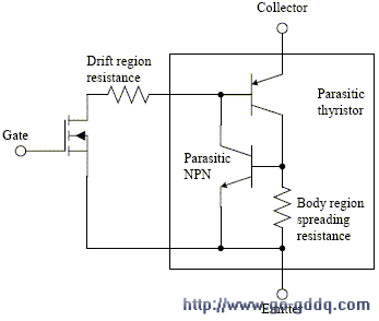 所有的N通道功率MOSFET都存在寄生NPN双极型晶体管,因此所有N3channel的IGBT也都存在。寄生NPN晶体管的基极是体区域,基极和发射极短接以防止晶体管开启。 但是请注意,体区域存在电阻,既体扩散电阻(body region spreading resistance),如图3所示。 P型衬底,漂移区和体区域组成了IGBT的PNP部分。该PNPN结构形成了寄生晶闸管。 如果寄生NPN晶体管开启并且NPN和PNP晶体管的增益和大于1,闭锁就发生了。 闭锁是通过优化IGBT的掺杂水平和设计不同区域的尺寸来避免的,如图1所示。